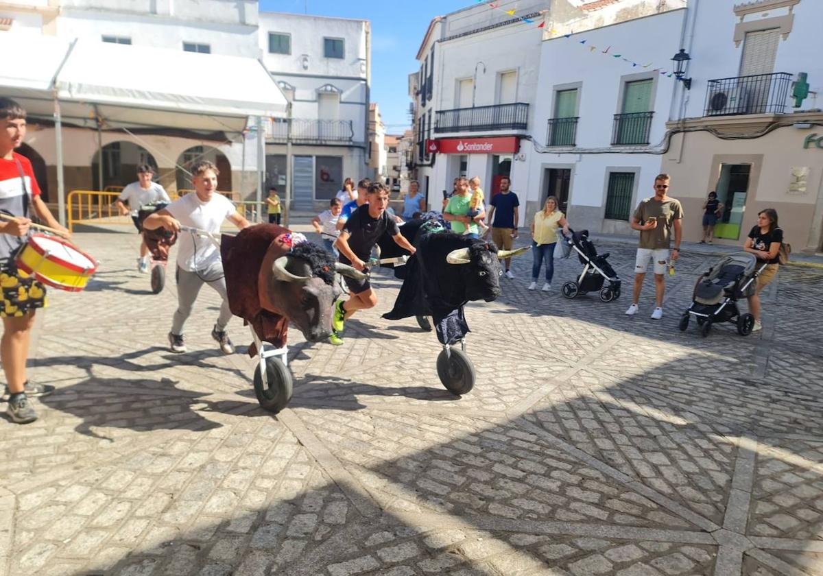 Sin tiempo para descansar, nada más recogerse los cabezudos, quienes allí se reunían se han desplazado hasta las 4 Esquinas escoltando a 4 grandes toros. Eran 4 carretillos preparados para simular 4 cabezas de toros que, empujados por los chicos que acababan de soltar los cabezudos, han subido hasta las 4 Esquinas para, con el también numeroso grupo de niños y padres que allí se reunían, correr el encierro infantil hasta la Plaza de la Constitución.