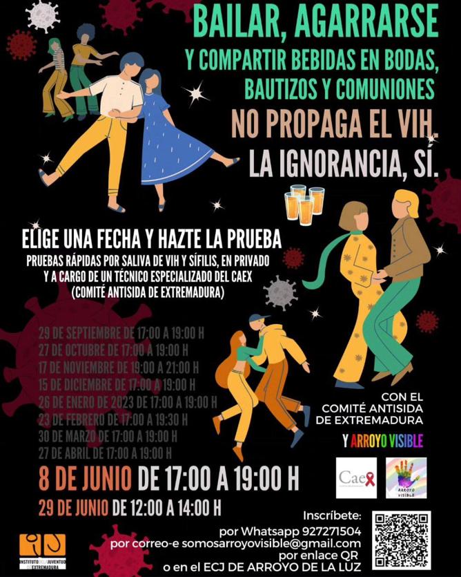 El Espacio para la Creación Joven de Arroyo de la Luz, con la colaboración de la asociación Arroyo Visible, va a acoger una nueva jornada ... de pruebas rápidas por saliva de VIH y síficles, las cuales serán realizadas por parte de un técnico especializado del CAEX (Comité Antisida de Extremadura).