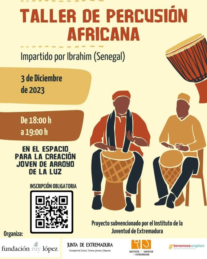 El próximo domingo, día 3 de diciembre, el Espacio para la Creación Joven de Arroyo de la Luz acogerá un taller gratuito de percusión africana.