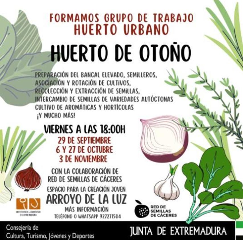 Hoy viernes, día 3 de noviembre, a las 18.00 horas, el grupo de trabajo que se encarga de elaborar el huerto urbano del Espacio ... para la Creación Joven de Arroyo de la Luz volverá a reunirse para su última cita de esta actividad y culminar así los trabajos de elaboración del mismo en las instalaciones del centro.