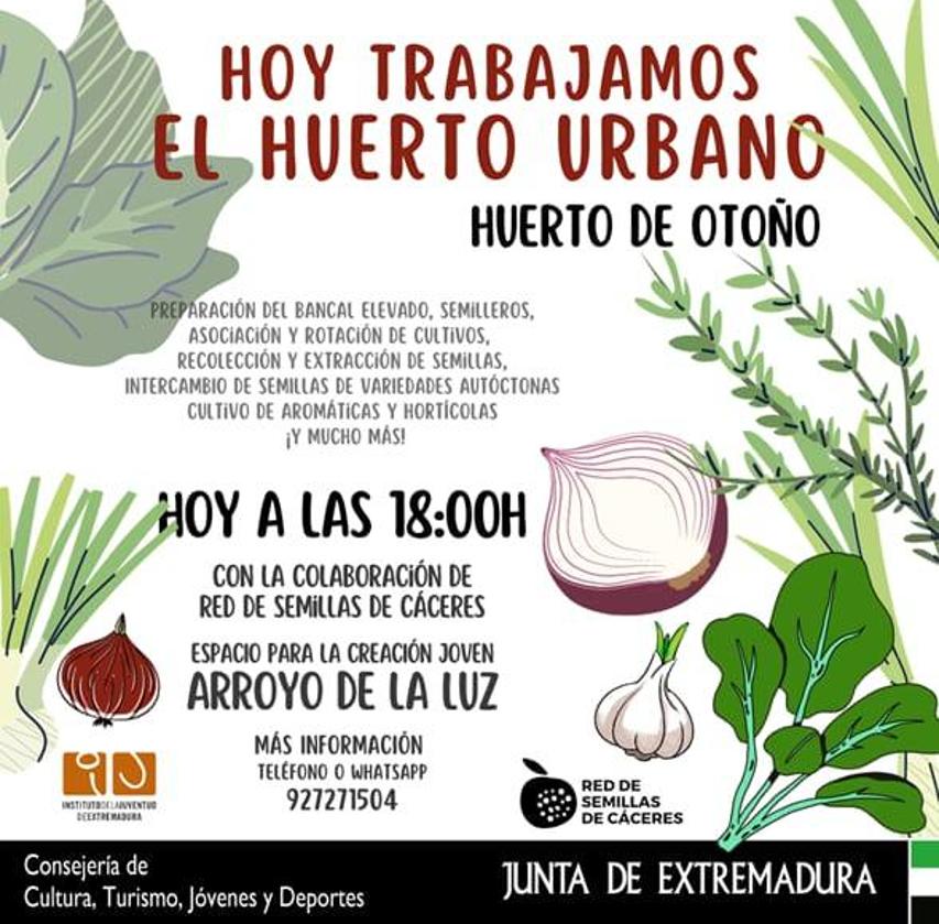 Hoy viernes, día 6 de octubre, a las 18.00 horas, el grupo de trabajo que se encarga de elaborar el huerto urbano del Espacio ... para la Creación Joven de Arroyo de la Luz volverá a reunirse para una segunda cita y continuar así con los trabajos de elaboración del mismo en las instalaciones del centro.