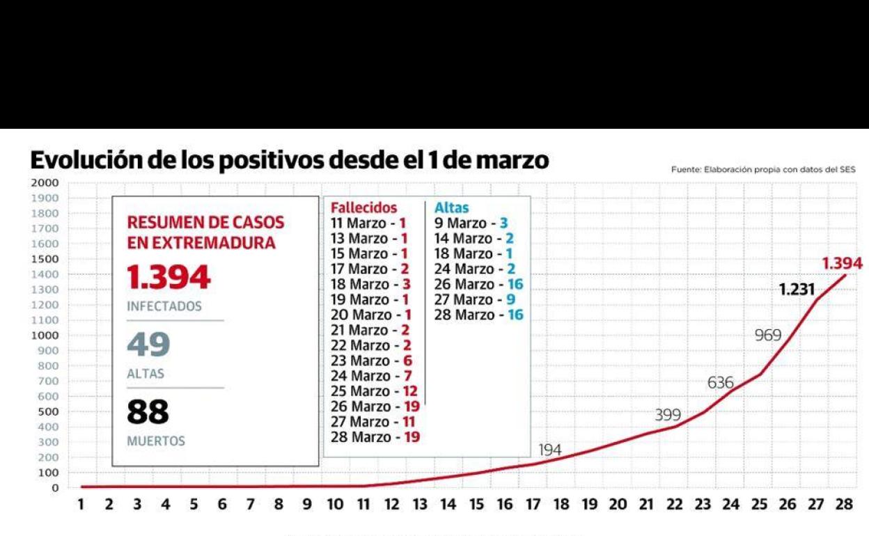 Extremadura volvió a sumar 19 víctimas del coronavirus en un solo día. Ocurrió el miércoles y se repitió el viernes, según informó este sábado el ... Ministerio de Sanidad. Los datos de la pandemia, actualizados hasta el viernes a las 20.00 horas, indican que el número de fallecidos en la región alcanza las 88 víctimas mortales, aunque el ritmo de contagios desciende.