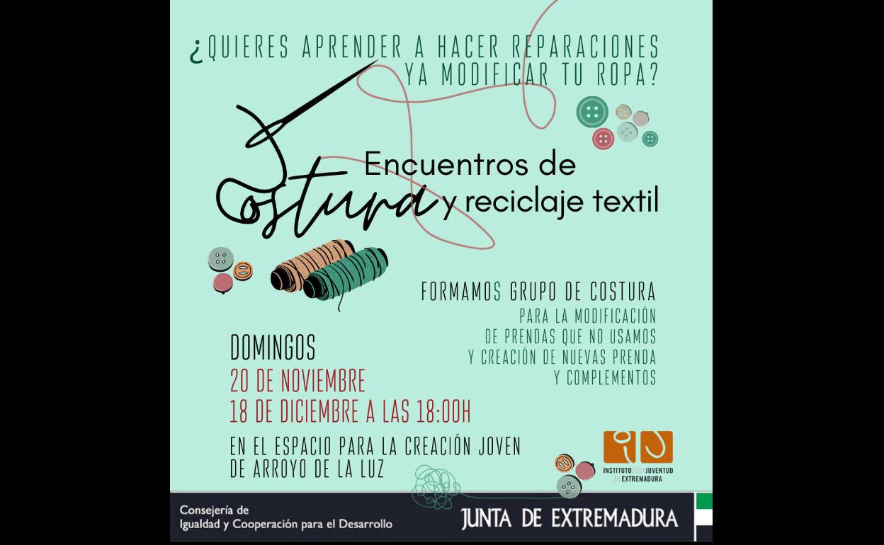 El Espacio para la Creación Joven de Arroyo de la Luz acogerá el próximo domingo, día 18 de diciembre, un Encuentro de Costura y Reciclaje ... Textil con el que los participantes podrán aprender a hacer reparaciones y a modificar su propia ropa, además de crear nuevas prendas y complementos.