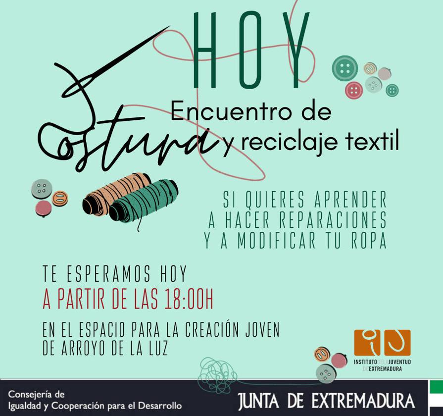 Durante la tarde de hoy domingo, día 4 de mayo, el Espacio para la Creación Joven de Arroyo de la Luz acogerá un encuentro de ... Costura y Reciclaje Textil con el que los participantes podrán aprender a hacer reparaciones y a modificar su propia ropa, además de crear nuevas prendas y complementos.
