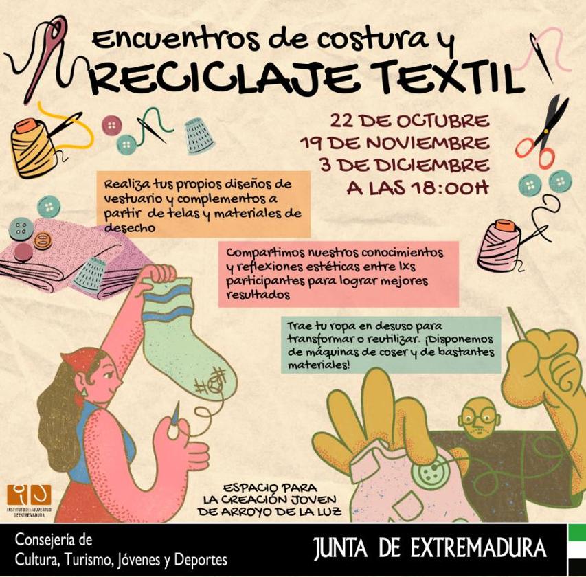 El Espacio para la Creación Joven de Arroyo de la Luz va a poner en marcha varios Encuentros de Costura y Reciclaje Textil. Los mismos ... comenzarán mañana domingo, día 22 de octubre, y continuarán el 19 de noviembre y el 3 de diciembre, comenzando todas las citas a las 18.00 horas.