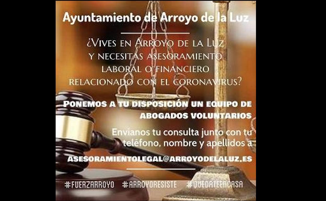 El Ayuntamiento de Arroyo de la Luz, en su afán de ayudar a la población arroyana a superar estos duros momentos que están viviendo los ... vecinos ocasionados por la crisis sanitaria del coronavirus que llevó el pasado 13 de marzo al confinamiento total de la localidad, ha puesto en marcha un nuevo servicio de asesoramiento legal a través de abogados voluntarios.