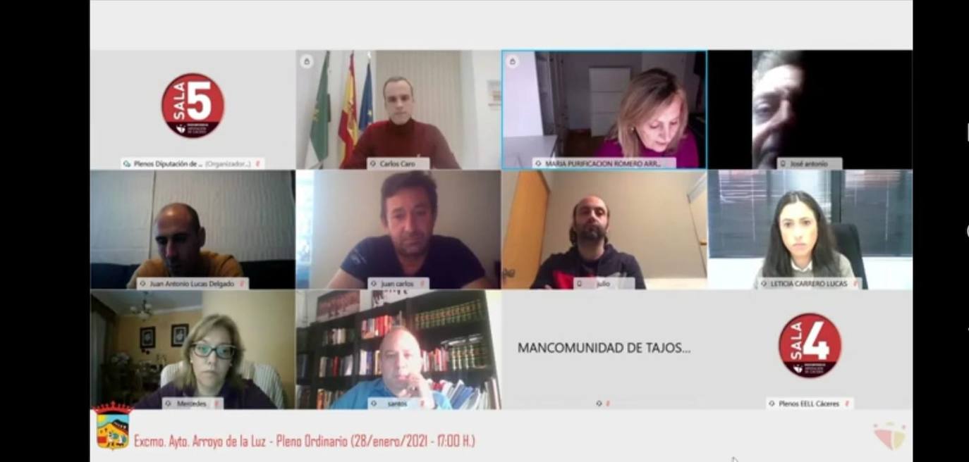 Debido a la crisis sanitaria y a la alta incidencia de casos que había a finales de enero en el municipio, con una tasa de incidencia de más de 1.000 casos de contagio por cada 100.000 habitantes a los 14 días, el pleno se celebró de forma telemática, el primero en la historia de Arroyo de la Luz. Este se llevó a cabo a través de la plataforma web habilitada para tal efecto por parte de la Diputación Provincial de Cáceres, con el objetivo de minimizar todo lo posible el riesgo de contagios en la localidad, teniendo en cuenta la convocatoria pública que supone el hecho de celebrar el propio pleno presencialmente. Al mismo asistieron el alcalde local, Carlos Caro, así como los concejales del grupo municipal de Partido Socialista Obrero Español y el concejal del grupo municipal del Partido Popular, y se ausentaron los 5 concejales del grupo municipal de la Agrupación Arroyana Independiente Agrai.