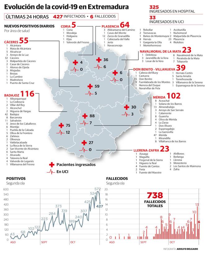 Extremadura ha bajado de los 500 contagios diarios tras tres jornadas consecutivas superando esa cifra. En las últimas 24 horas la región ha notificado 427 positivos de covid-19 y seis fallecidos.