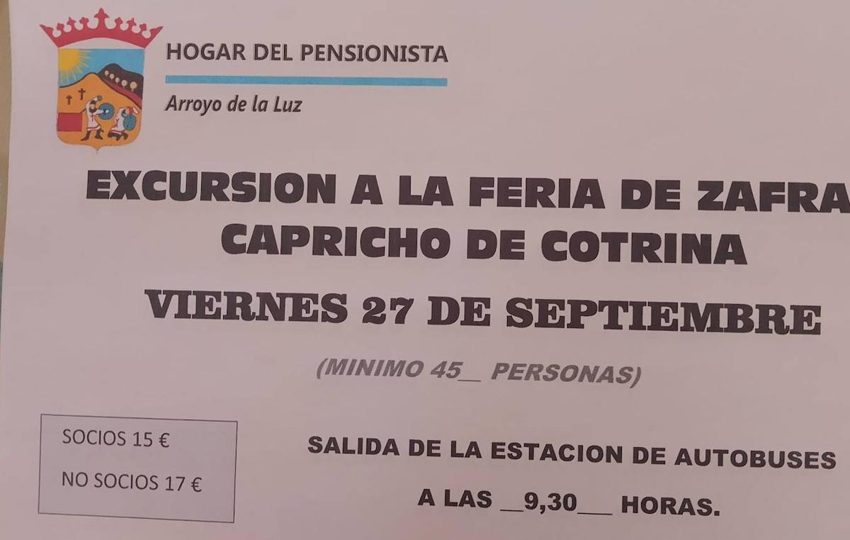 El Hogar del Pensionista de Arroyo de la Luz ha organizado una excursión para asistir a la Feira de Zafra y visitar el Capricho de Cotrina. La excursión se llevará a cabo el 27 de septiembre con salida a las 9.30 horas desde la estación de autobuses.