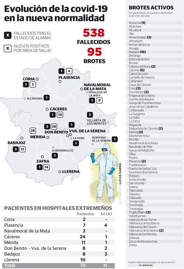 Extremadura ha comunicado en la última jornada 185 casos positivos de covid-19 confirmados por PCR y un nuevo brote en Navalmoral de la Mata ... con cinco positivos y 13 contactos en seguimiento. Hace justo una semana, la región alcanzaba el pico de contagios de la desescalada con 128 positivos, una cifra que se superó el viernes con 177 y que volvió a ser mayor el sábado, con 223. Por tanto, la cifra de contagios de hoy es la segunda más alta notificada en la nueva normalidad.