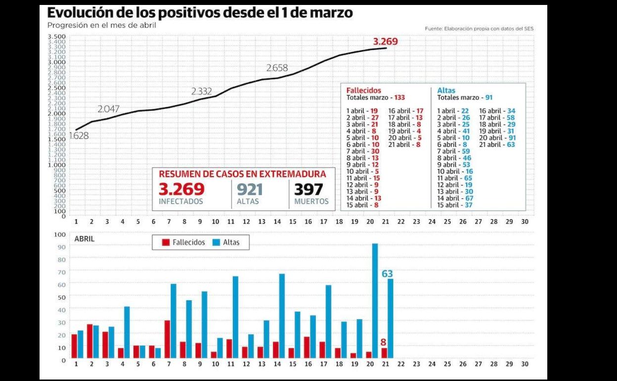 La Junta de Extremadura dio este martes a conocer 26 nuevos contagios. Según los datos del Ministerio de Sanidad, diez corresponden a casos sintomáticos y 16 asintomáticos.