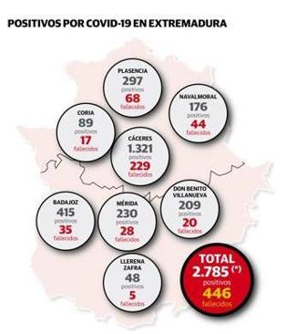 Navalmoral de la Mata sigue con 176 casos y baja a catorce hospitalizados. Se mantiene en 44 víctimas y llega a 125 altas tras dar 16. Coria, con 89 casos, y Llerena-Zafra, con 48, tampoco registran nuevos positivos. La primera sigue con 17 fallecidos y 61 curados y la segunda con cinco y 26, respectivamente.
