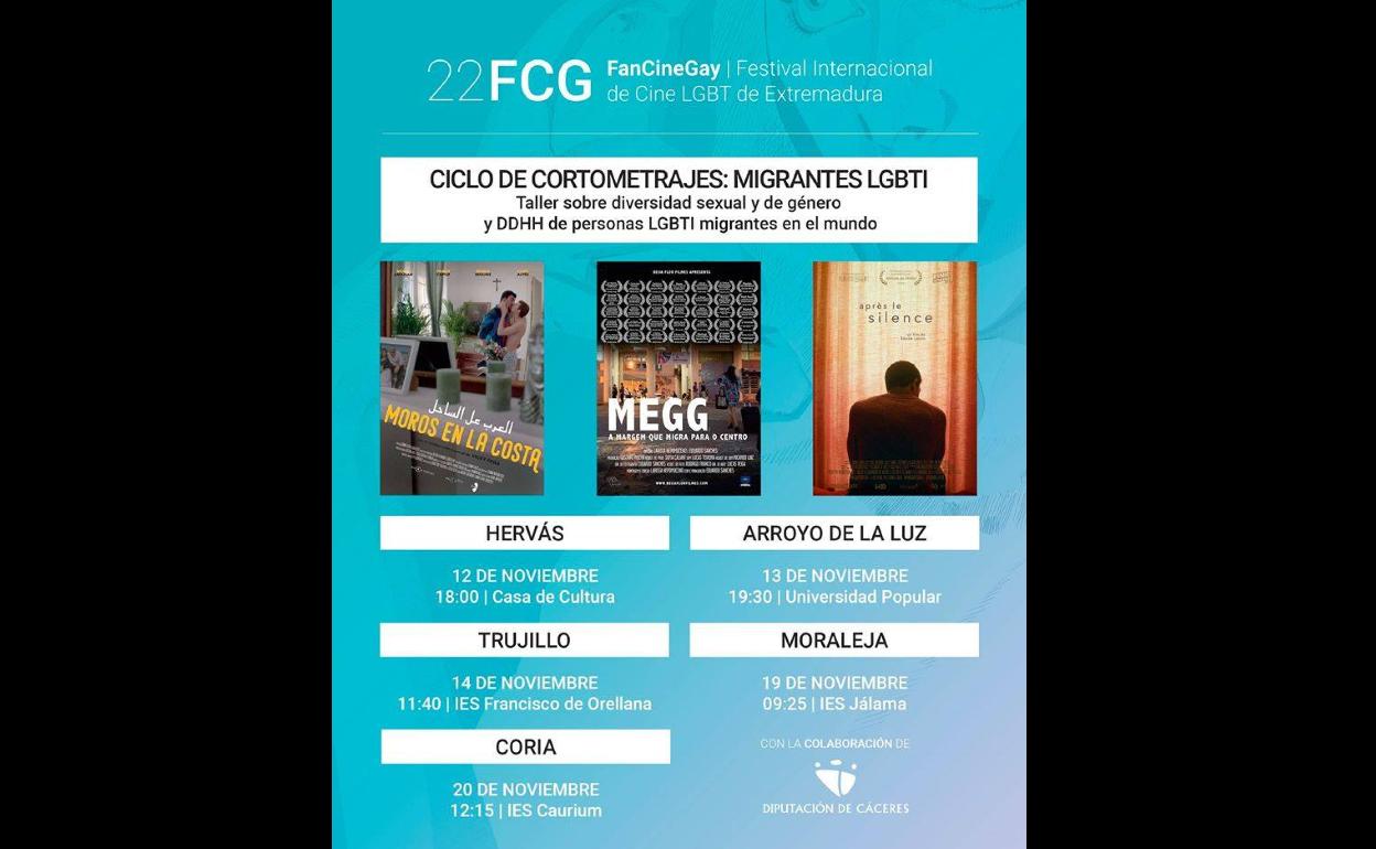Mañana miércoles, día 13 de noviembre, a las 19.30 horas, la Universidad Popular de Arroyo de la Luz acogerá el ciclo de cortometrajes 'Migrantes ... LGBTI' de la edición 22 del Festival Internacional de cine LGTB Extremadura 'Fancinegay', organizado por la Fundación Triángulo Extremadura.