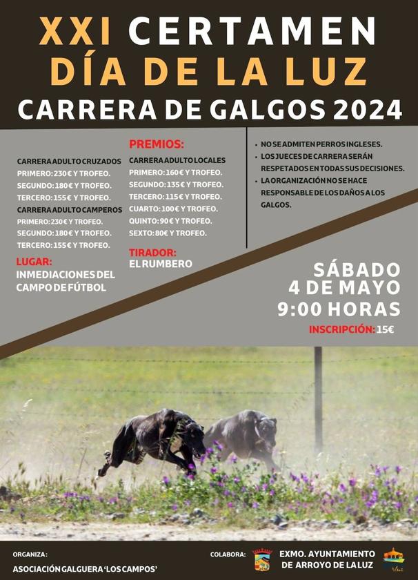 El próximo sábado, día 4 de mayo, a las 9.00 horas, se celebrará en las inmediaciones del Campo de Fútbol el Certamen Día de ... la Luz Carrera de Galgos, un evento que cada año se enmarca dentro del programa de actos del Día de la Luz y que este año tuvo que aplazarse a consecuencia de las fuertes lluvias que barrieron la península durante la Semana Santa.