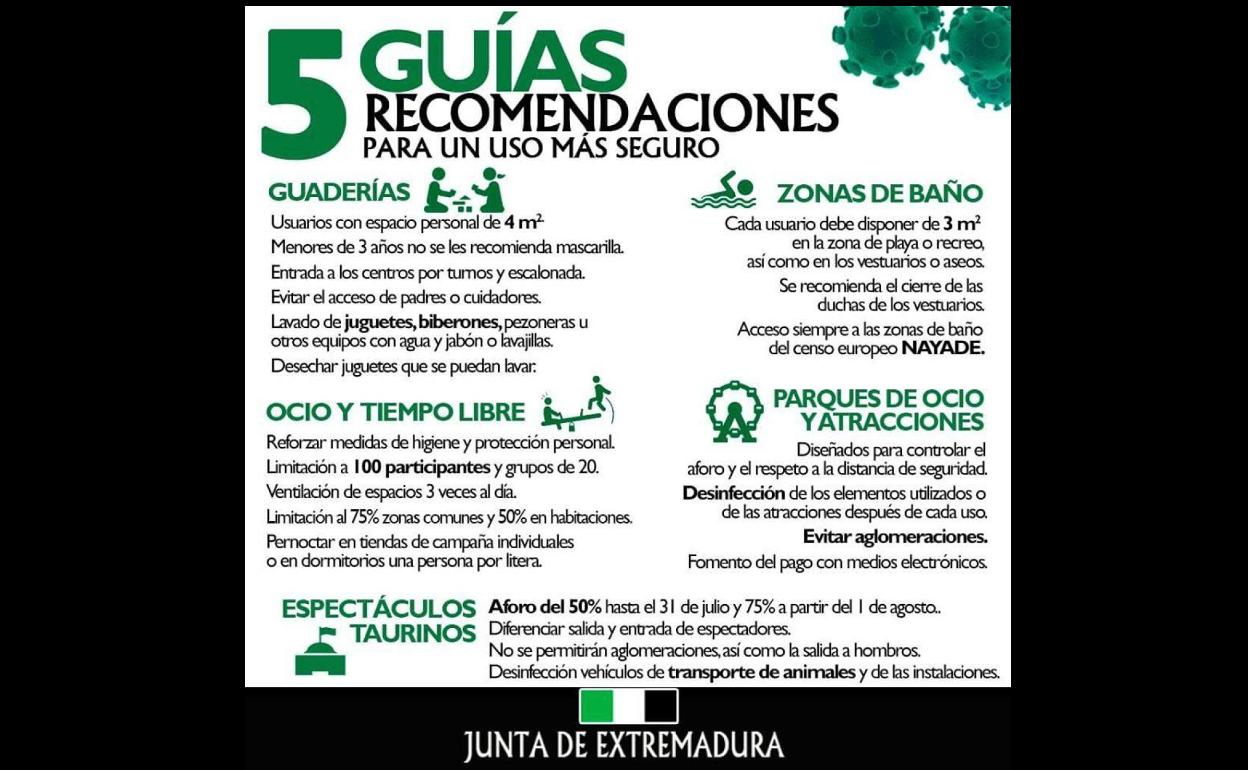 El Ayuntamiento de Arroyo de la Luz a compartido, a través de sus redes sociales, la guía de recomendaciones 'para un uso más seguro' elaborada ... por la junta de de Extremadura y que incluye recomendaciones para la apertura de guarderías, zonas de baño, espacios de ocio y tiempo libre, parques de ocio y atracciones y espectáculos taurinos.