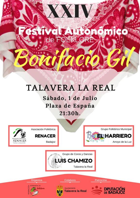 Mañana sábado, día 1 de julio, se celebrará el XXIV Festival Autonómico de Folklore Bonifacio Gil en Talavera la Real, donde participará el Grupo Folklórico ... Municipal El Harriero, de Arroyo de la Luz, junto con la Asociación Folklórica Renacer, de Badajoz, y el Grupo de Coros y Danzas Luis Chamizo, de Talavera la Real.