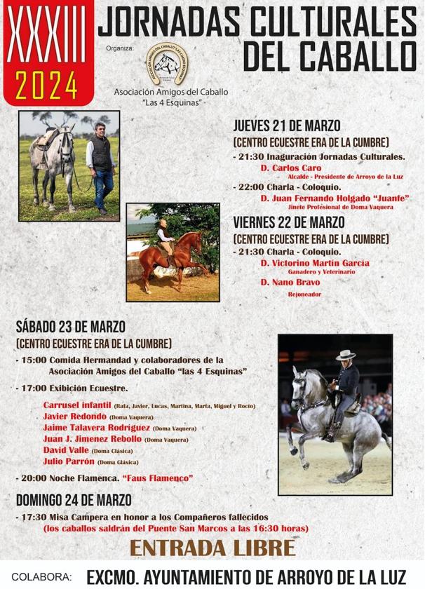 El próximo 1 de abril Arroyo de la Luz volverá a disfrutar de su día grande, el Día de la Luz, declarado Fiesta de Interés Turístico Regional. Alrededor del mismo, cada año se celebran diferentes actividades. Una de ellas son las Jornadas Culturales del Caballo que organiza la Asociación Amigos del Caballo 'Las 4 Esquinas', con la colaboración del Ayuntamiento de la localidad, y que este año cumple su XXXIII edición.
