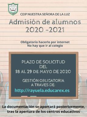 El colegio público Nuestra Señora de la Luz de Arroyo de la Luz, informa que en el D.O.E. n1 86 de 6 de ... mayo se ha publicado la Resolución de la Secretaría General de Educación referente a la modificación del calendario y próxima apertura del procedimiento de admisión de alumnos para el próximo curso 2020-2021 en los centros educativos de Extremadura, el cual había sido suspendido por el R.D. de alarma nacional del pasado 13 de marzo.