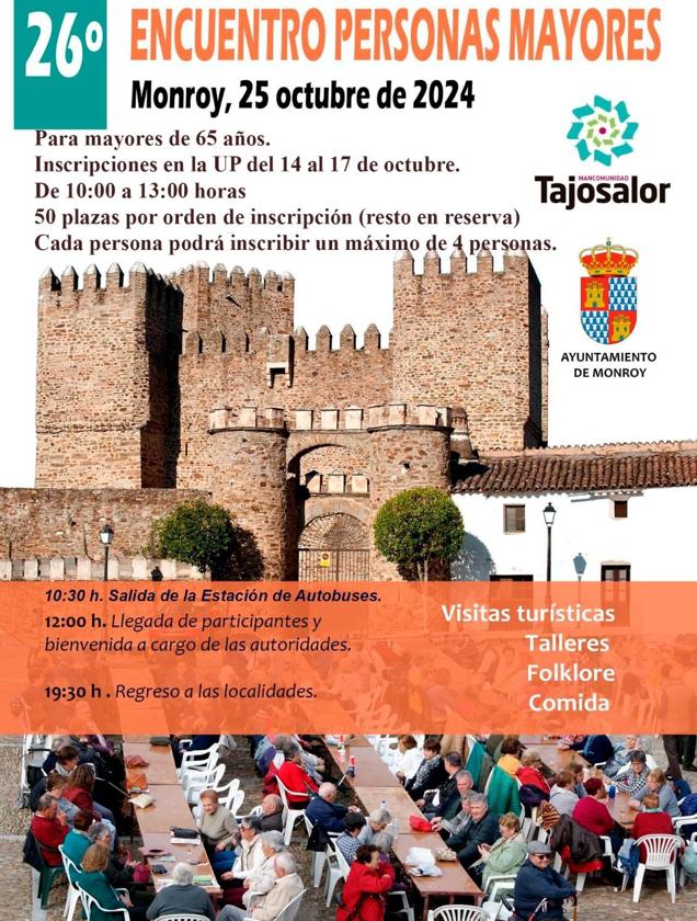 La Mancomunidad de Municipios Tajo-Salor, a la que pertenece la localidad de Arroyo de la Luz, ha organizado un nuevo encuentro de Personas Mayores que se celebrará este año en Monroy, concretamente el 25 del presente mes de octubre.