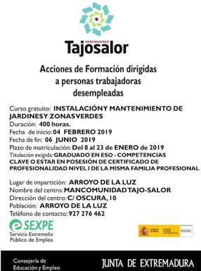 El curso de Instalación y Mantenimiento de Jardines y Zonas Verdes, de la Mancomunidad Tajo-Salor, que se encuentra dentro del programa de acciones de ... formación dirigidas a personas trabajadoras desempleadas, se impartirá en Arroyo de la Luz.