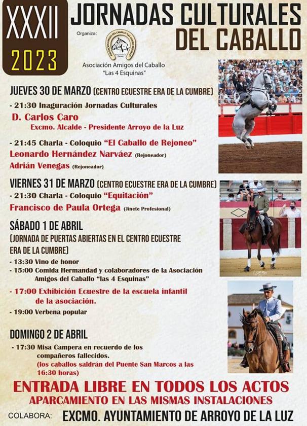 El próximo 10 de abril Arroyo de la Luz volverá a disfrutar de su día grande, el Día de la Luz, declarado Fiesta de Interés ... Turístico Regional. Alrededor del mismo, cada año se celebran diferentes actividades. Una de ellas son las Jornadas Culturales del Caballo que organiza la Asociación Amigos del Caballo 'Las 4 Esquinas', con la colaboración del Ayuntamiento de la localidad, y que este año cumple su XXXII edición.