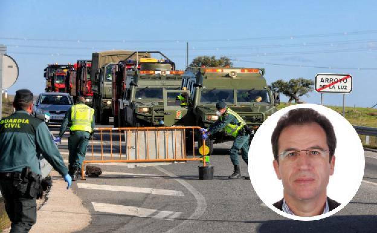 Los vehículos de la UME entrando en la localidad de Arroyo de la Luz ayer por la tarde; en el destacado, Juan Manuel García.