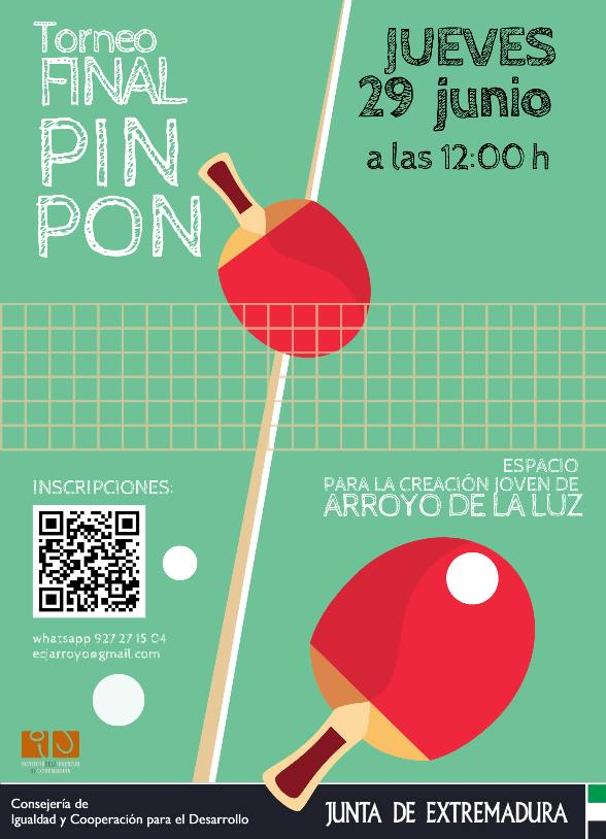El próximo jueves, día 29 de junio, el Espacio para la Creación de Arroyo de la Luz acogerá los partidos de la final del Torneo ... de Pin Pon, el cual comenzó el pasado mes de noviembre y se han estado jugando torneos mensuales desde entonces.