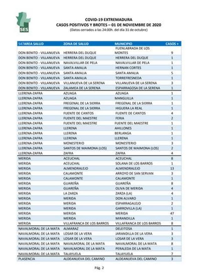 El informe de la dirección general de Salud Pública de este domingo ha notificado 427 casos confirmados. El área de salud de Badajoz es la ... que más contagios notifica, con 116. En cuanto a localidades, las que suman más positivos son Mérida, 47; Badajoz, 42; Cáceres, 32; Plasencia, 23; Don Benito, 15; Almendralejo, 13; Zarza de Granadilla, 12, y Barcarrota, 11.