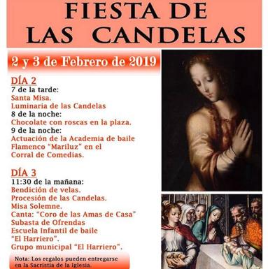 El domingo, 3 de febrero, los actos comenzarán a las 11.30 horas con la bendición de velas, tras la que saldrá la procesión de las Candelas. Después se celebrará la Misa Solemne, cantada por el coro de las Amas de Casa. Finalizada la misa se llevará a cabo la tradicional subasta de ofrendas y, para finalizar, actuará el grupo municipal y la escuela infantil de baile 'El Harriero'.