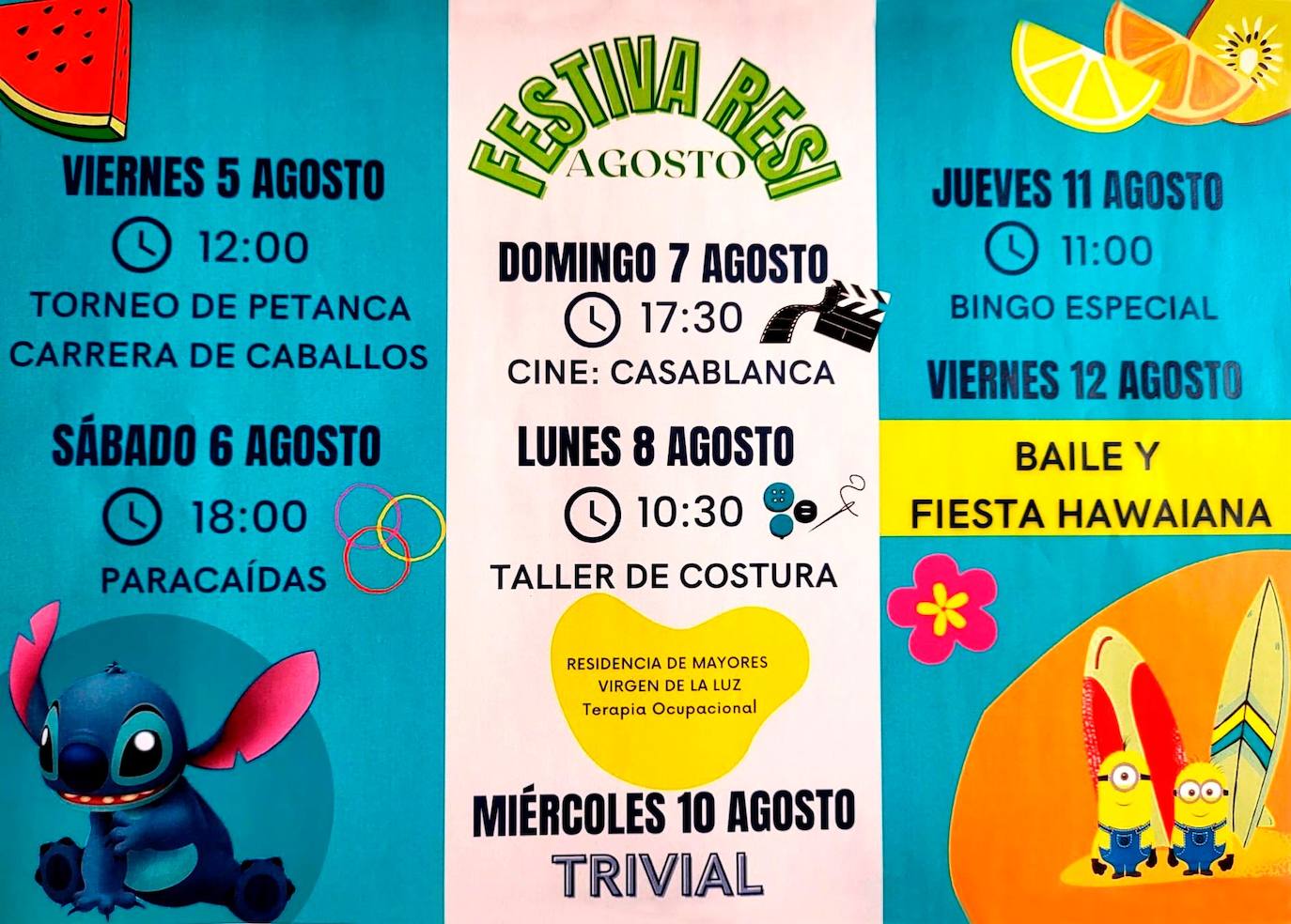 El primero de ellos, como se ha señalado, será el próximo viernes 5 de agosto a las 12.00 horas, cuando se llevará a cabo un Torneo de Petanca y una Carrera de Caballos. El sábado 6, a las 18.00 horas, tendrá lugar una actividad con paracaídas. Por su parte, el domingo 7 de agosto, a las 17.30 horas, los residentes disfrutarán de la proyección de la cinta 'Casablanca'.