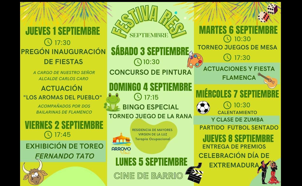 La Residencia de Mayores Virgen de la Luz, de Arroyo de la Luz, va a disfrutar de una variada programación gracias al Festiva Resi, donde se incluyen diferentes actividades organizadas con motivo del Día de Extremadura y de las presentes Ferias de Septiembre.