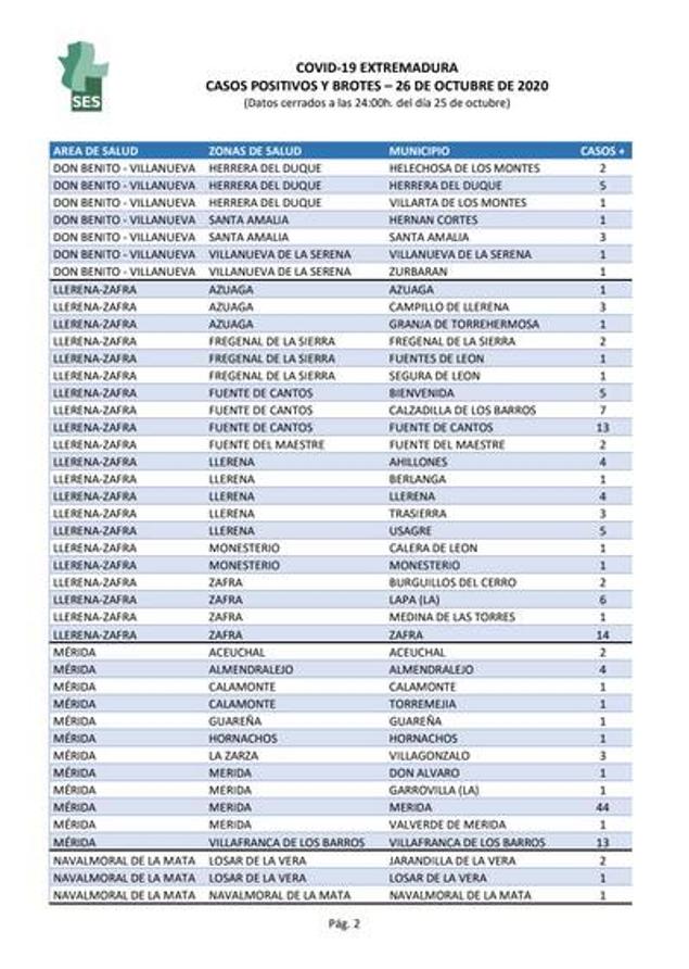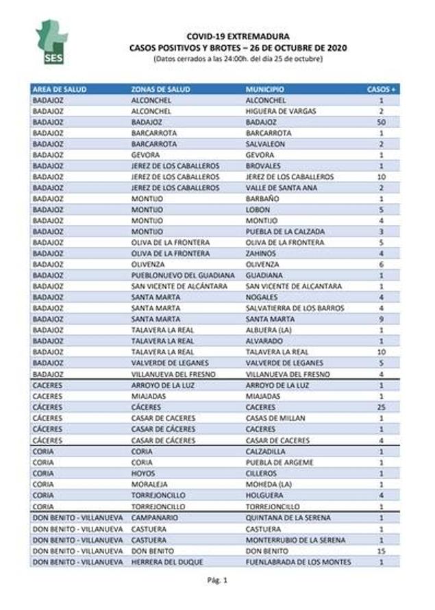 La región notifica este lunes, 26 de octubre, 374 positivos confirmados por PCR, 120 menos que ayer. La población que registra más contagios es Badajoz, ... con 50; seguida de Mérida, con 44, y Cáceres, con 25. Dentro de las cifras que más sobresalen están Don Benito con 15, Zafra con 14 y Fuente de Cantos y Villafranca de los Barros, con 13 cada una.