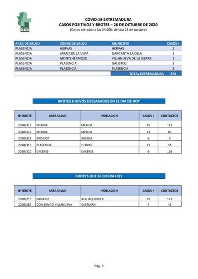 La región notifica este lunes, 26 de octubre, 374 positivos confirmados por PCR, 120 menos que ayer. La población que registra más contagios es Badajoz, con 50; seguida de Mérida, con 44, y Cáceres, con 25. Dentro de las cifras que más sobresalen están Don Benito con 15, Zafra con 14 y Fuente de Cantos y Villafranca de los Barros, con 13 cada una.