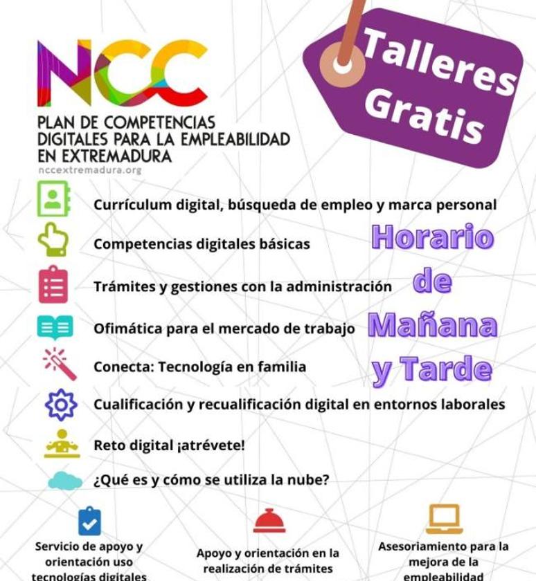 Su oferta incluye talleres de 'currículum digital, búsqueda de empleo y marca personal', 'competencias digitales básicas', 'trámites y gestiones con la administración', 'ofimática para el mercado de trabajo', 'conecta: tecnología en familia', 'cualificación y recualificación digital en entornos laborales', 'reto digital ¡atrévete!', '¿Qué es y cómo se utiliza la nube?'.