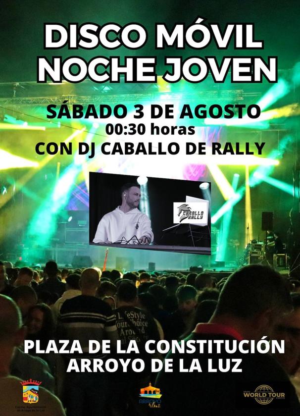 Para el próximo sábado, día 3 de agosto, el Ayuntamiento de Arroyo de la Luz ha organizado la Noche Joven, en la que los asistentes podrán disfrutar con la música de una disco móvil hasta altas horas de la madrugada. La noche comenzará a las 00.30 horas con DJ Caballo de Rally, en la Plaza de la Constitución.