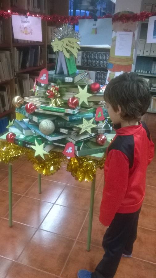 En el mes de diciembre desde la biblioteca pública municipal de la localidad, se anima estas fechas con un árbol de navidad construido con libros.