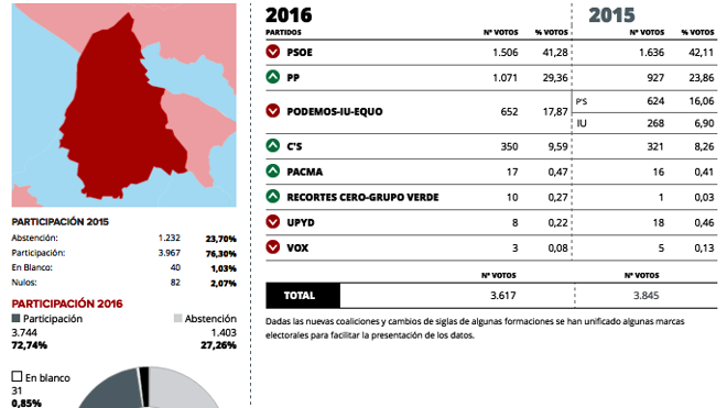 Con un 72,74 por ciento de participación, un 4 por ciento menos que en el 20-D, y el 100 por cien del voto ... escrutado, el PSOE ha ganado las elecciones en Arroyo de la Luz. Partido que, pese ha haber visto reducido su número de apoyos en el 26-J, al igual Unidos Podemos, UPyD y Vox, ha conseguido mantener su liderazgo. Asimismo, PP, Ciudadanos, Pacma y Recortes Cero- Grupo Verde han aumentado su número de votos en estos comicios con respecto al pasado ejercicio.