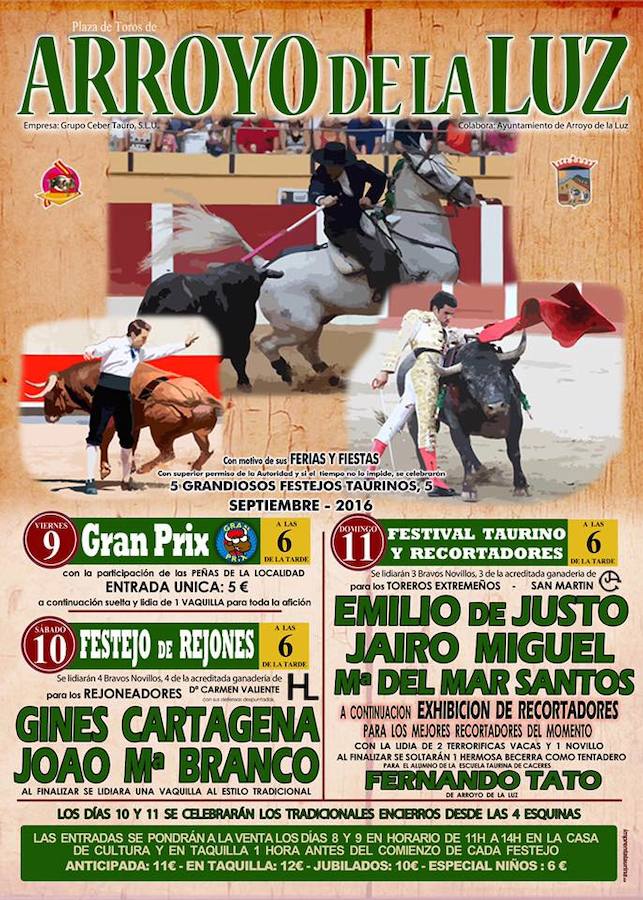 Arroyo de la Luz acoge varios eventos taurinos con motivo de las fiestas de la localidad. El primero será el día 9 con un Gran ... Prix en el que participarán las peñas de la localidad y comenzará a las 18.00 horas de la tarde, cuya entrada tendrá un precio de 5 euros. Y a continuación, se soltará y lidiará una vaquilla para toda la afición.