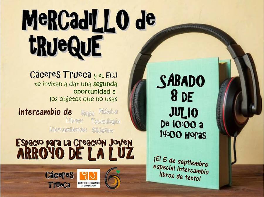 Y este fin de semana vuelve el mercadillo de trueque el sábado 8 de julio de 10.00 a 14.00 horas. Es una actividad organizada junto a Cáceres Trueca. Puede asistir toda aquella interesada en dar una segunda oportunidad a los objetos que no se usan. Puede ser ropa, libros, música y todo aquello que ya no necesites pero que para otra persona pueda ser de utilidad.