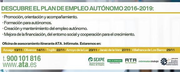 El Ayuntamiento de Arroyo de la Luz informa que todos l@s TRABAJADORES AUTÓNOMOS o EMPRENDEDORES tienen hoy una gran oportunidad de recibir ASESORAMIENTO PERSONALIZADO: ... Durante el día de hoy, 23 DE NOVIEMBRE, y en horario de 11:00 a 14:00 horas y de 16:00 a 18:00 horas en la Universidad Popular dos asesoras jurídicas pertenecientes a ATA (Asociación de Trabajadores Autónomos de Extremadura) asesorarán y responderán a todas sus dudas relativas: Puesta en marcha y desarrollo de la actividad empresarial. Novedades de la Nueva Ley de Autónomos. Ayudas económicas. Cómo darse de alta (para emprendedores) Cualquier tipo de asesoramiento en general en el sector de autónomo. No dejes escapar esta OPORTUNIDAD. Proyecto puesto en funcionamiento por ATA en colaboración con el SEXPE.