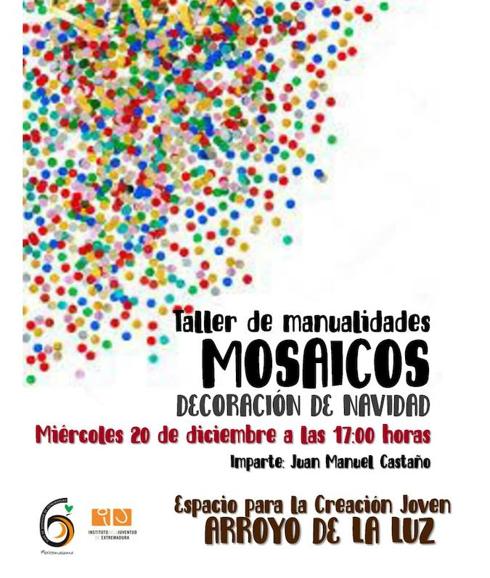 El ECJ de Arroyo de la luz acogerá el taller de manualidades Mosaicos de decoración de navidad el miercoles 20 de diciembre a las 17: ... 00 horas.