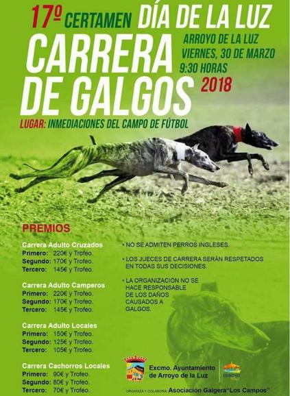 El Ayuntamiento de Arroyo de la Luz, en colaboración con la Asociación Galgera Los Campos organiza el 17º certamen Día de la Luz de Carreras ... de Galgos, con motivo de las fiestas del Día de la Luz y dentro de la programación de las actividades de Semana Santa.