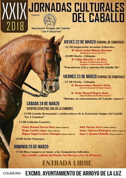 La Asociación Amigos del Caballo Las 4 Esquinas organiza, en colaboración con el Ayuntamiento de Arroyo de la Luz, las Jornadas Culturales del Caballo. Serán ... 4 días dedicados al mundo del caballo, un animal que es signo de identidad del pueblo de Arroyo de la Luz.