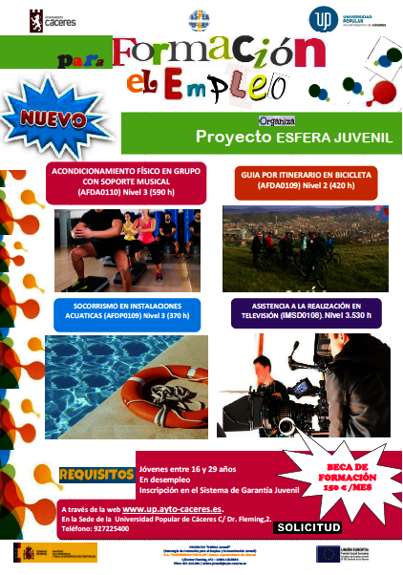 Los cursos están dirigidos a jóvenes desempleados y es requisito indispensable estar inscritos en el Sistema de Garantía Juvenil, que se puede hacer en el Sexpe o en el Centro de Creación Joven de la Concejalía de la Juventud. Las personas participantes serán preseleccionadas por el SEXPE, no por la Universidad Popular, ni por el Ayuntamiento.