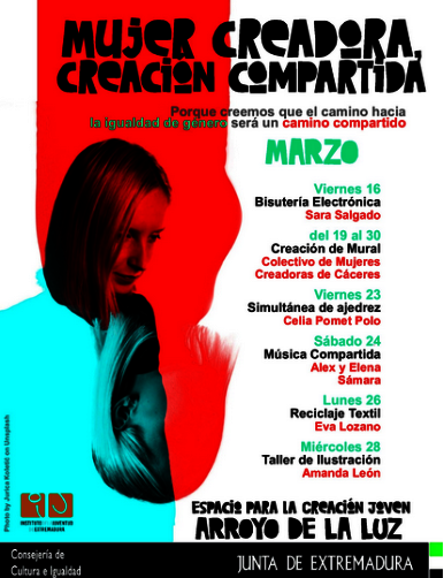 Con motivo del Día Internacional de la Mujer, que se celebró el pasado 8 de marzo, el Espacio para la Creación Joven de Arroyo de ... la Luz, dependiente del Instituto de la Juventud de Extremadura, ha estado organizando junto con sus usuarios una serie de actividades bajo el título Mujer creadora, creación compartida.