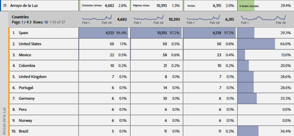 Cabe destacar que el HOY Arroyo de la Luz contó con 4.513 usuarios únicos procedentes de España en el mes de febrero, los cuáles visitaron 10.105 páginas, seguido de 50 visitantes únicos de Estados Unidos, que visitaron 50 páginas, 22 usuarios únicos de México, que visitaron 58 páginas. Le sigue Colombia, con 10 usuarios únicos y 21 páginas leídas. Reino Unido a continuación, con 7 usuarios únicos y 8 páginas leídas y Portugal, con 6 usuarios únicos y 14 páginas leídas. En Estados Unidos accedieron a través de las redes sociales el 66%, los que más, frente al 13% de México, donde prefirieron entrar a través de la web del periódico Hoy Arroyo de la Luz.
