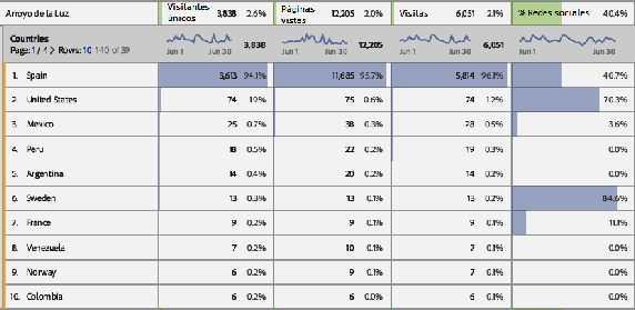 Después encontramos 18 usuarios únicos de Perú, que han visitado 22 páginas y 14 de Argentina, con 20 páginas vistas. Como dato, estos dos entran siempre a través de la página web, ya que han registrado 0 visitas a través de las redes sociales.
