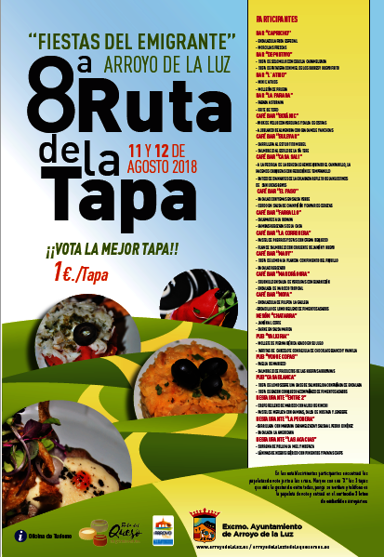 Coincidiendo con las Fiestas del Emigrante, la 8ª edición de la Ruta de la Tapa en Arroyo de la Luz se celebrará los días 11 ... y 12 de Agosto.