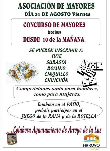 El Ayuntamiento de Arroyo de la Luz ha informado, a través de la aplicación web Bandomóvil, que toda persona mayor que sea socia del Hogar ... de Mayores de la localidad, puede inscribirse al concurso de mayores en las modalidades de tute, subasta y dominó.