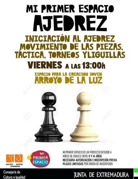 El ECJ de Arroyo de la Luz está acogiendo todos los viernes a las 13:00 horas Mi Primer Espacio de Ajedrez, dentro del proyecto ... Mi Primer Espacio, dirigido a niños de edades entre los 11 y los 14 años.